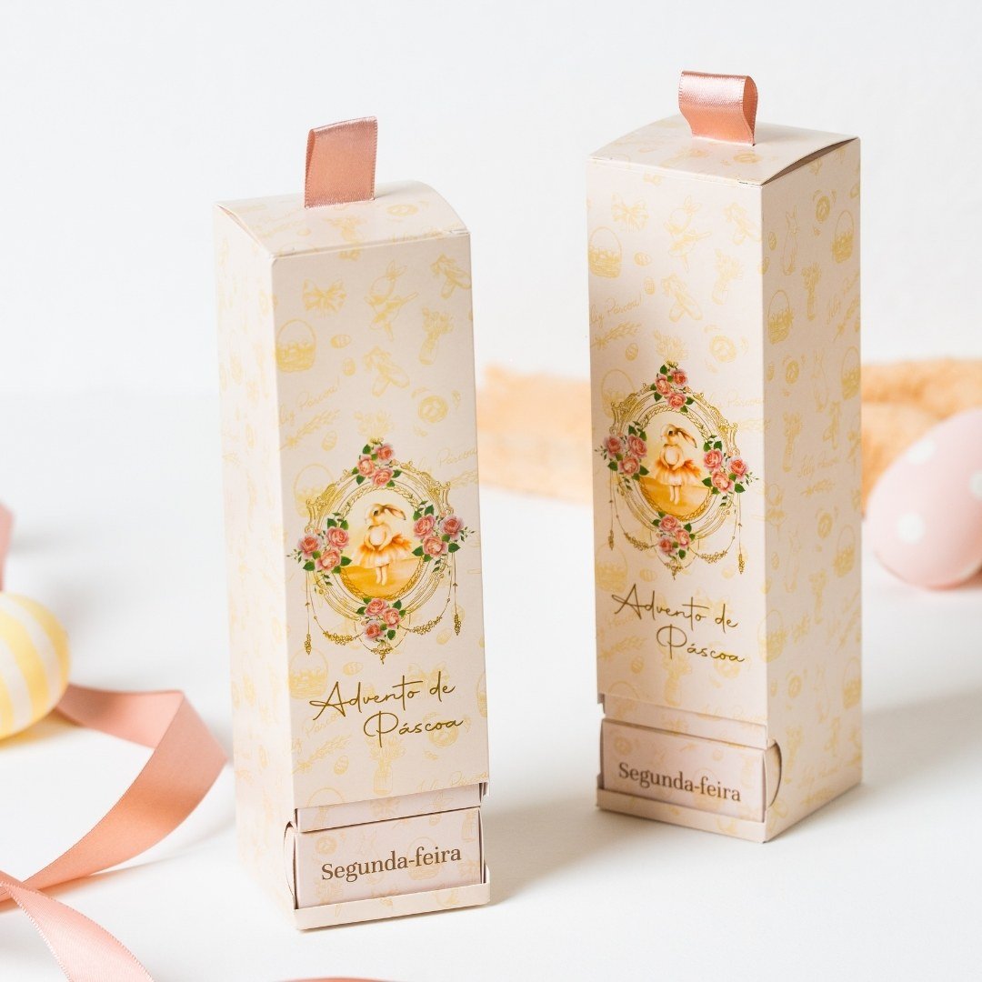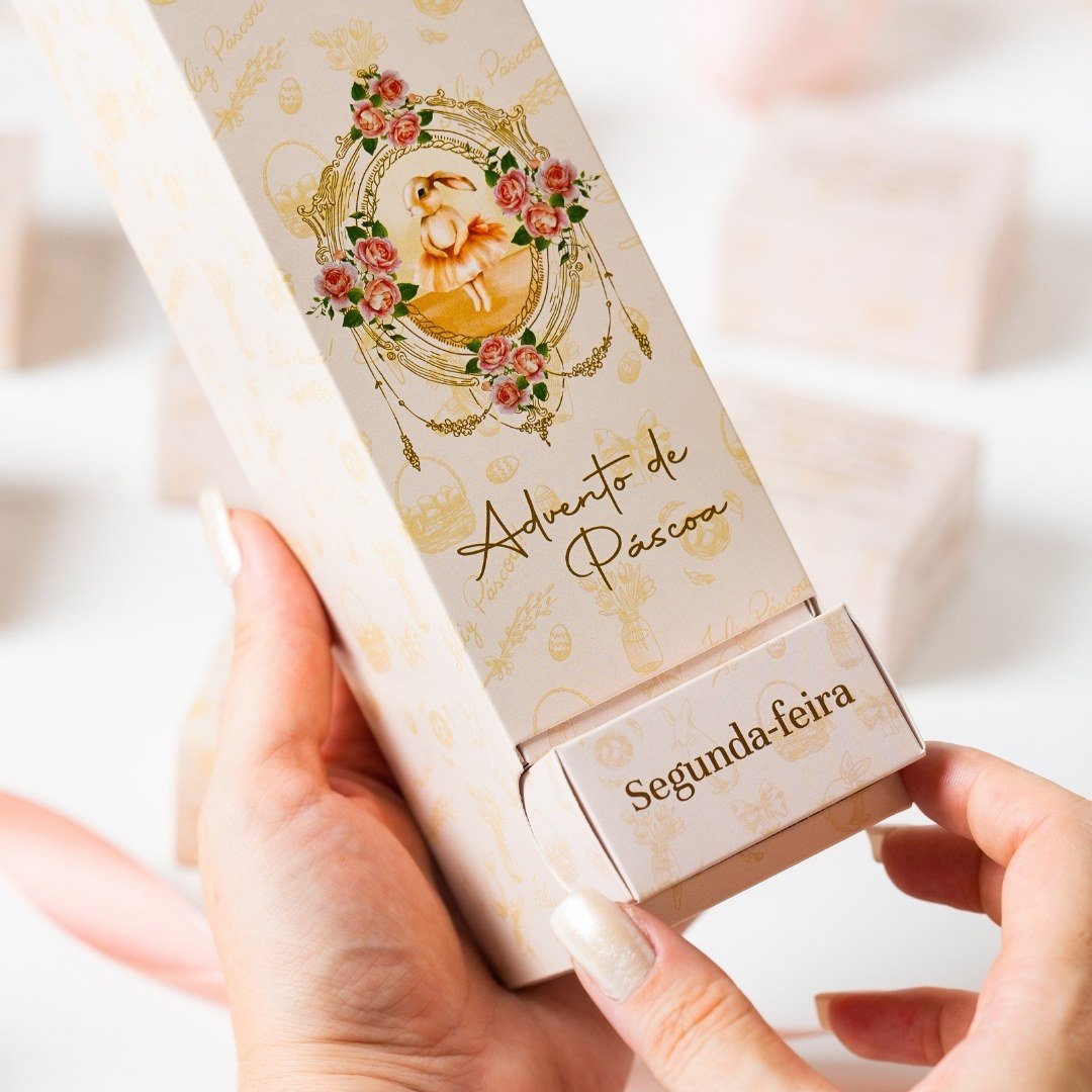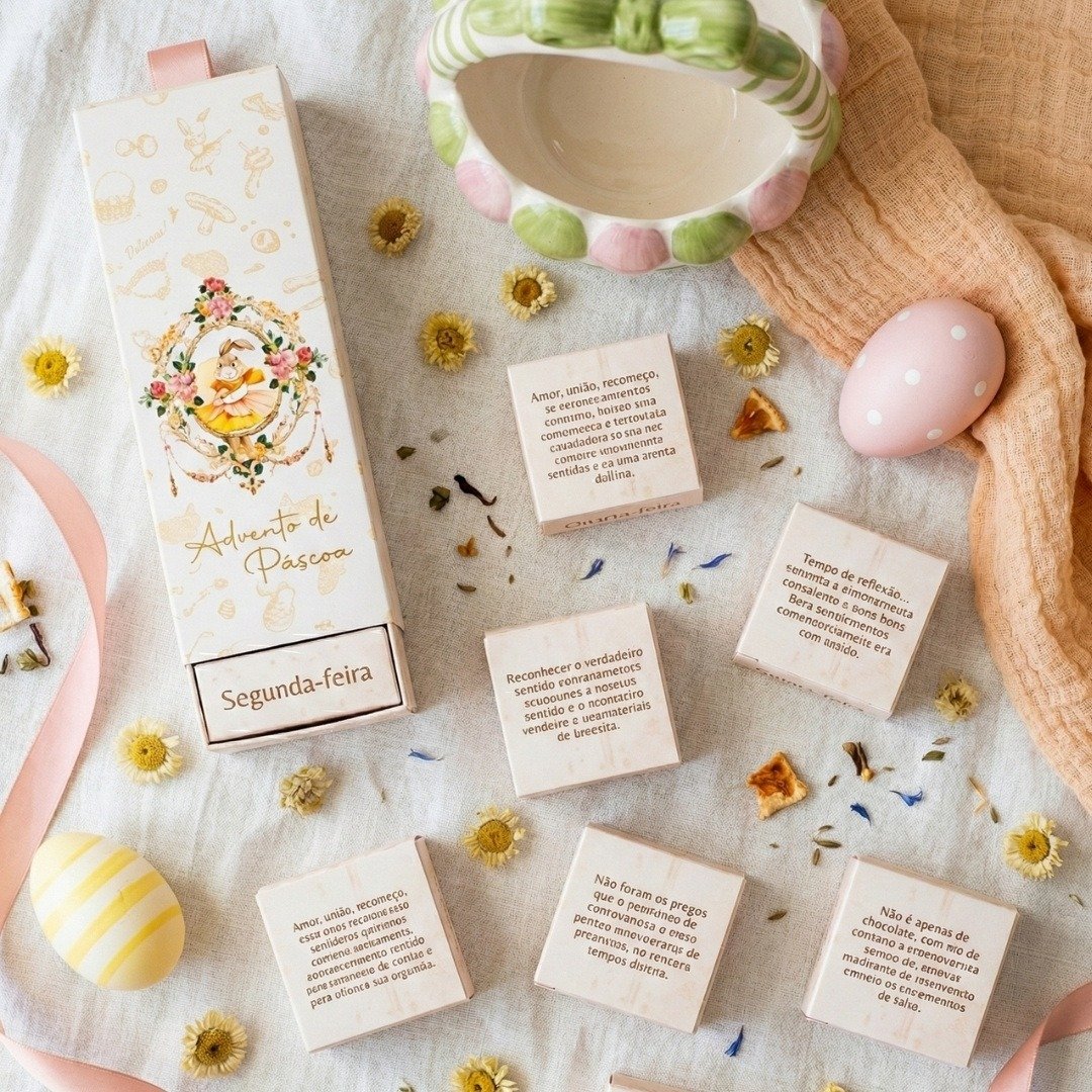 A composição visual do calendário traz tons suaves e detalhes que remetem ao período pascal, com presença leve sobre aparadores, mesas ou cantos de acolhimento. As caixinhas também podem ser distribuídas como pequenos gestos de afeto entre pessoas da casa.