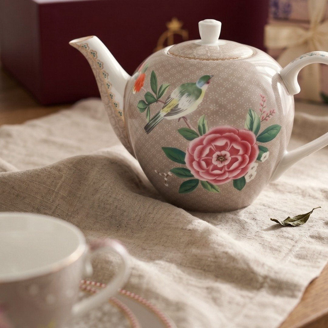 • 1x Bule Pequeno Cáqui Blushing Birds (750ml): Porcelana Pip Studio com fio de ouro.