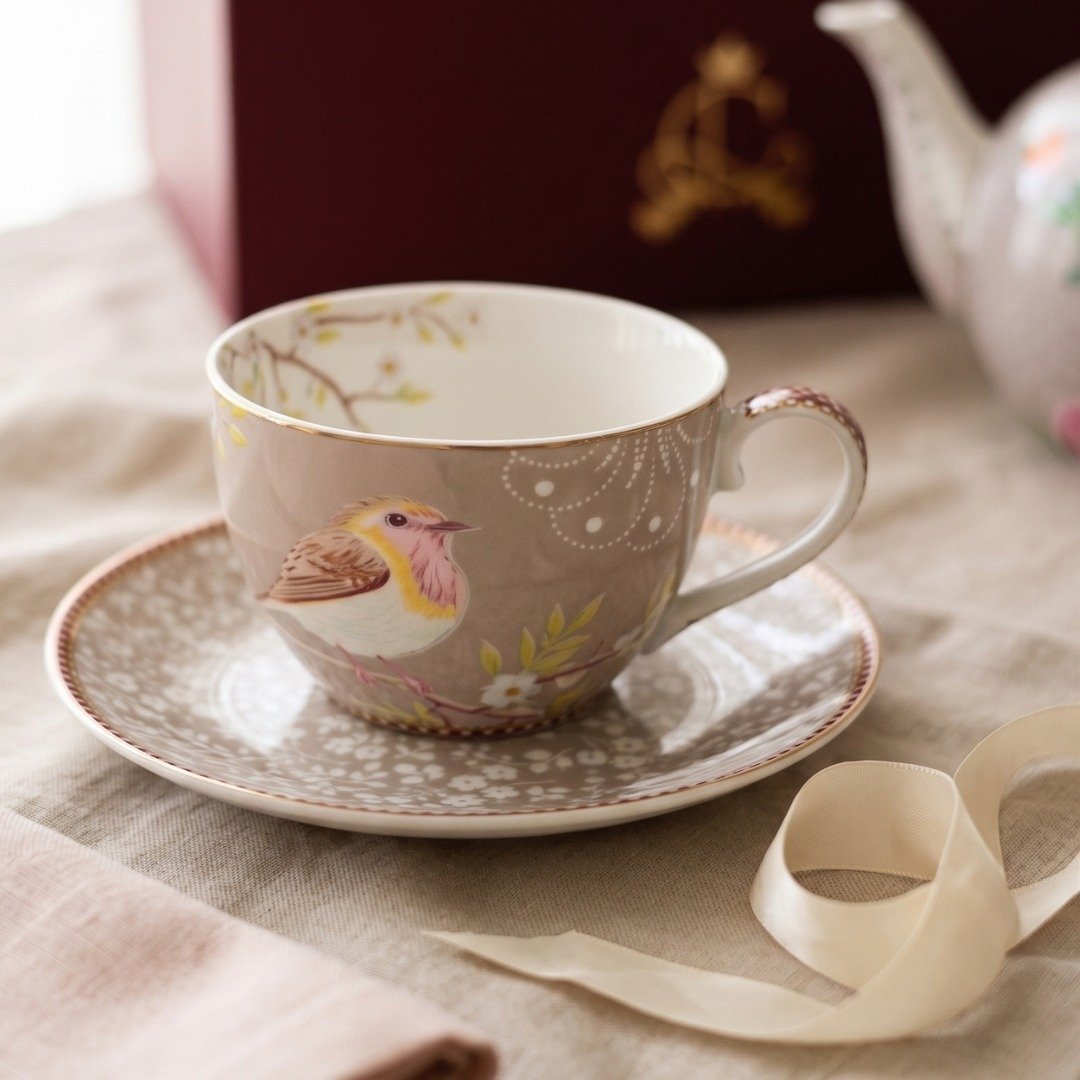 • 1x Xícara de Chá com Pires Cáqui Early Bird (280ml): Porcelana Pip Studio com ilustração de pássaros e fio de ouro.