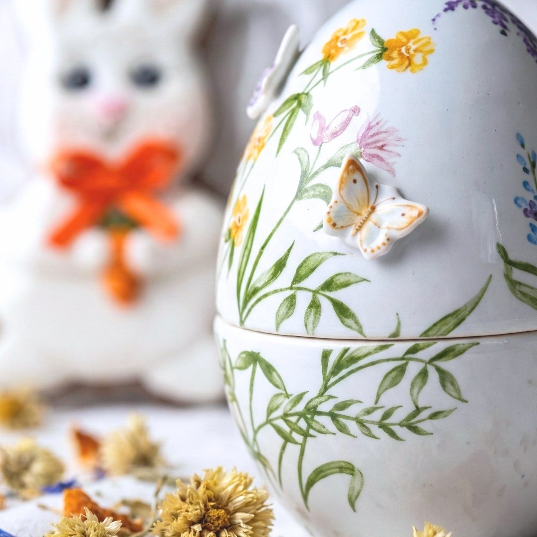 O ato de presentear na Páscoa ganha a forma de um relicário atemporal. O pote em formato de ovo, graciosamente moldado em cerâmica, apresenta uma superfície adornada por pinturas de lavandas e flores silvestres. Suas borboletas esculpidas em relevo oferecem um toque tátil e afetuoso, convidando as mãos a explorarem a peça. Ao abrir esta obra, descortina-se um verdadeiro esconderijo desenhado para celebrar a memória e a surpresa.