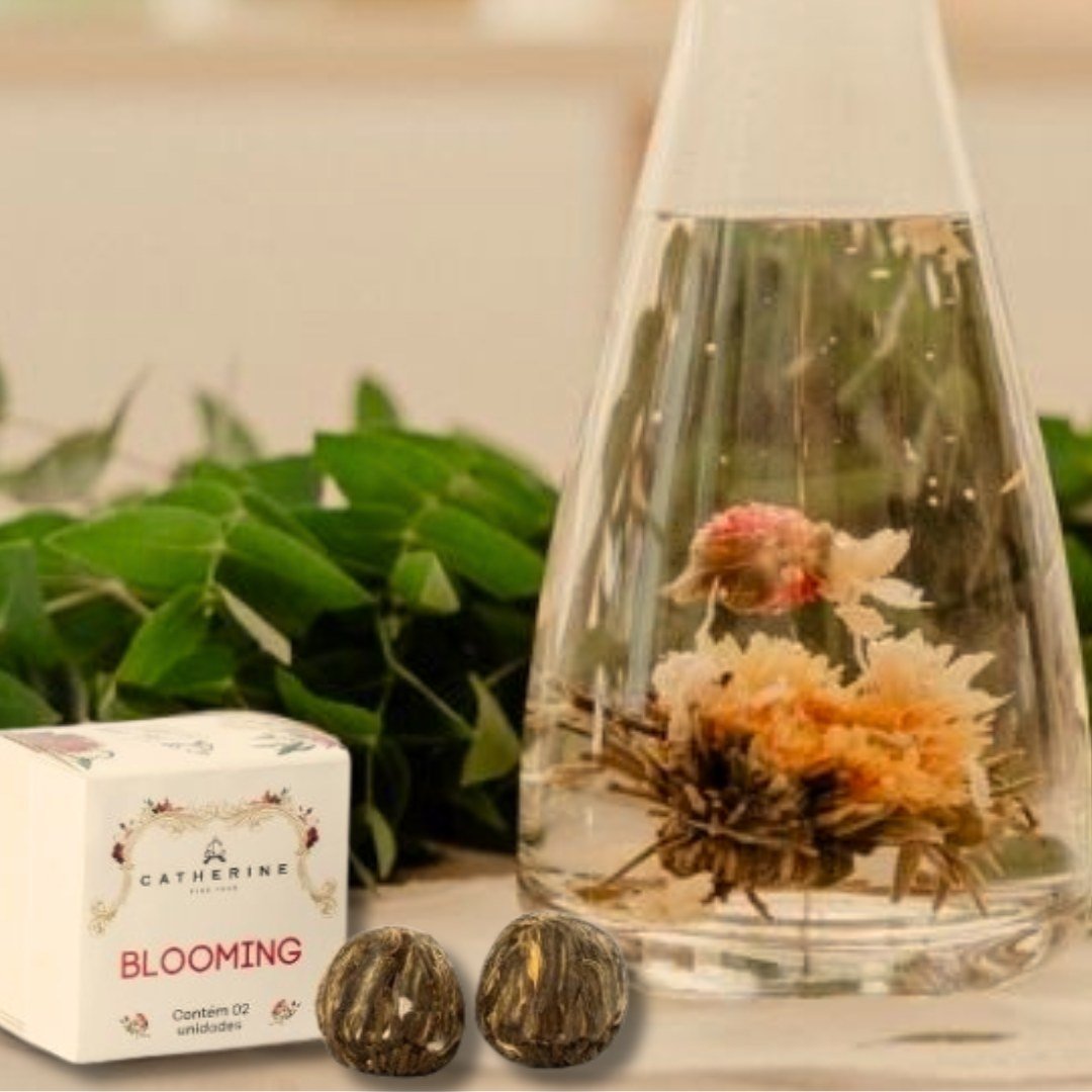 Acompanhando, 1 caixa com duas unidades do encantador Chá da Flor (blooming tea) — pequenos buquês costurados à mão, que florescem lentamente na água quente, criando um espetáculo sensorial de rara beleza. Um tributo à arte milenar do chá e ao tempo que desabrocha.