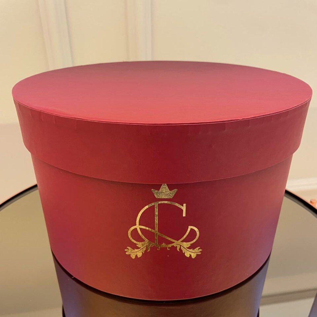 Tudo é envolvido pela Catherine Bordeaux Box, nossa icônica caixa redonda em tom bordô profundo. Com acabamento fosco e monograma dourado, ela transforma o presente em memória — desde o primeiro olhar.