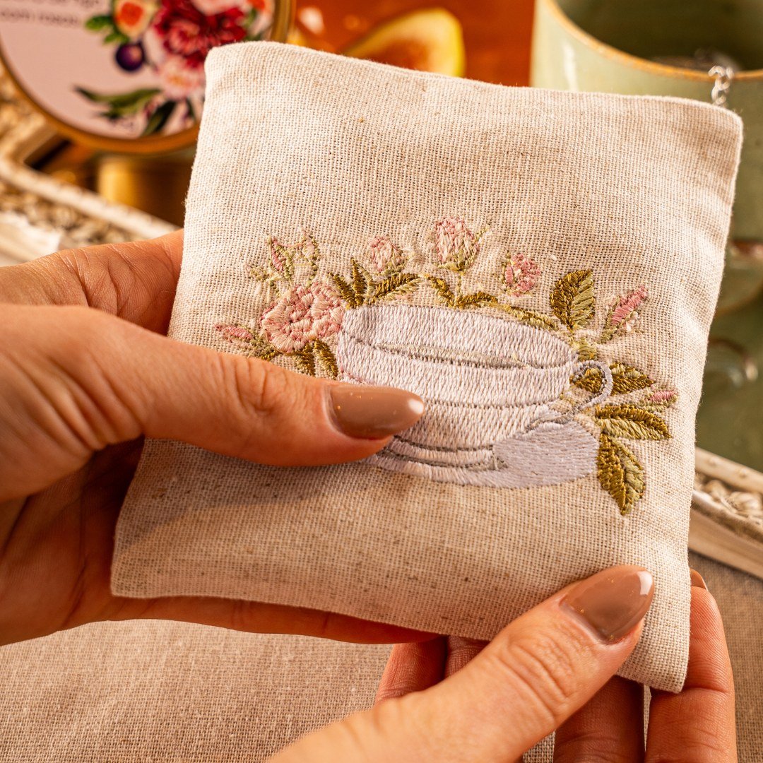 A experiência se intensifica com a Mini Almofada Afago — almofada aromática bordada à mão, que perfuma suavemente e acomoda sua xícara como um gesto de acolhimento. Um toque artesanal que convida ao silêncio e ao bem-estar.