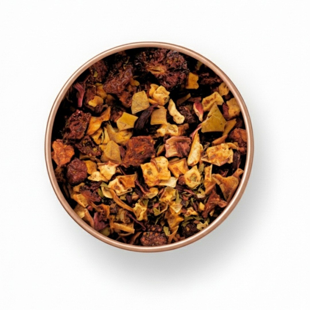 Colorida e vibrante, esta infusão combina a suavidade da maçã ao frescor do hibisco, realçada pela presença marcante do morango e da cranberry. O toque herbal da hortelã acrescenta vivacidade e equilíbrio, resultando em um blend refrescante e acolhedor, que encanta desde o primeiro contato com seu aroma intenso até a tonalidade rubi luminosa que colore a xícara.