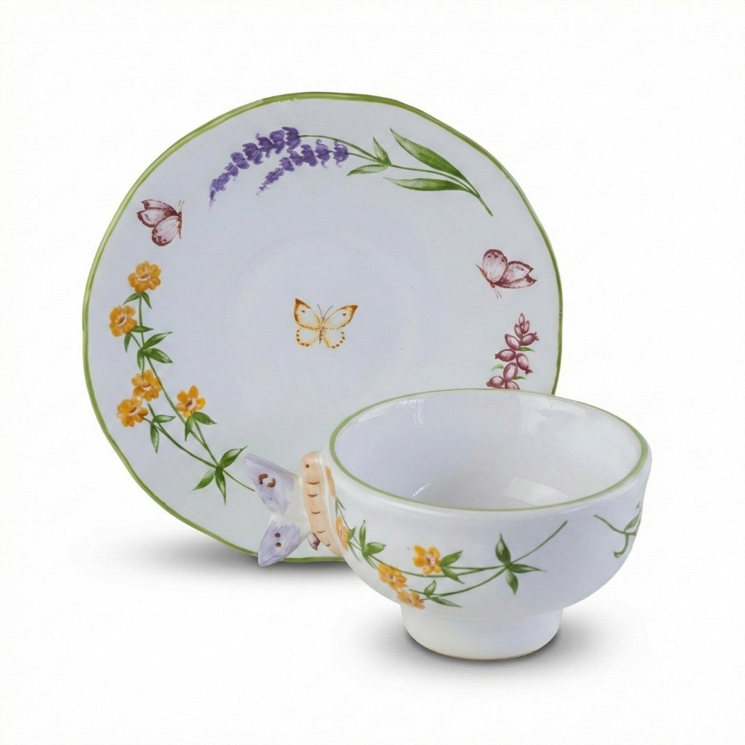 Confeccionada em porcelana de acabamento esmaltado brilhante, a peça revela um sutil friso verde nas bordas que emoldura a infusão. O pires, cuidadosamente desenhado com proporções harmônicas, serve como um palco para a xícara, exibindo pinturas botânicas e borboletas que parecem pousar ao redor do serviço, visíveis até mesmo quando repousado em uma caixa de presente. A espessura do material retém o calor com precisão, preservando a temperatura e os aromas do seu blend.