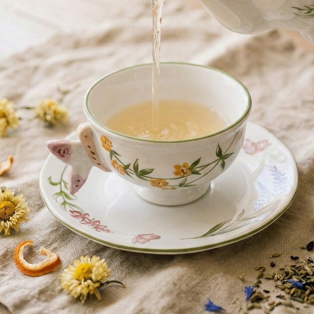 Aqueça a porcelana previamente com água quente para manter o aconchego do serviço. A xícara emoldura com elegância chás claros, florais e blends tradicionais, compondo um cenário de afeto ao lado do bule da mesma coleção e guardanapos em tons crus ou pastéis.